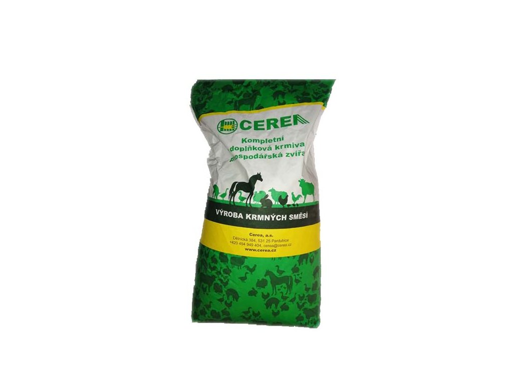 Složení: Pšenice, Kukuřice, Sojový extrahovaný šrot loupaný, toastovaný, Ječmen, Řepkový extrahovaný šrot, Slunečnicový extrahovaný šrot, Len extrudovaný, Cukr řepný, Uhličitan vápenatý, Chlorid sodný, Monokalcium fosfát a Oxid hořečnatý.Analytické složky: Hrubý protein 18.2 %, Hrubá vláknina 4.3 %, Hrubý tuk 2.9 %, Hrubý popel 6 %.
