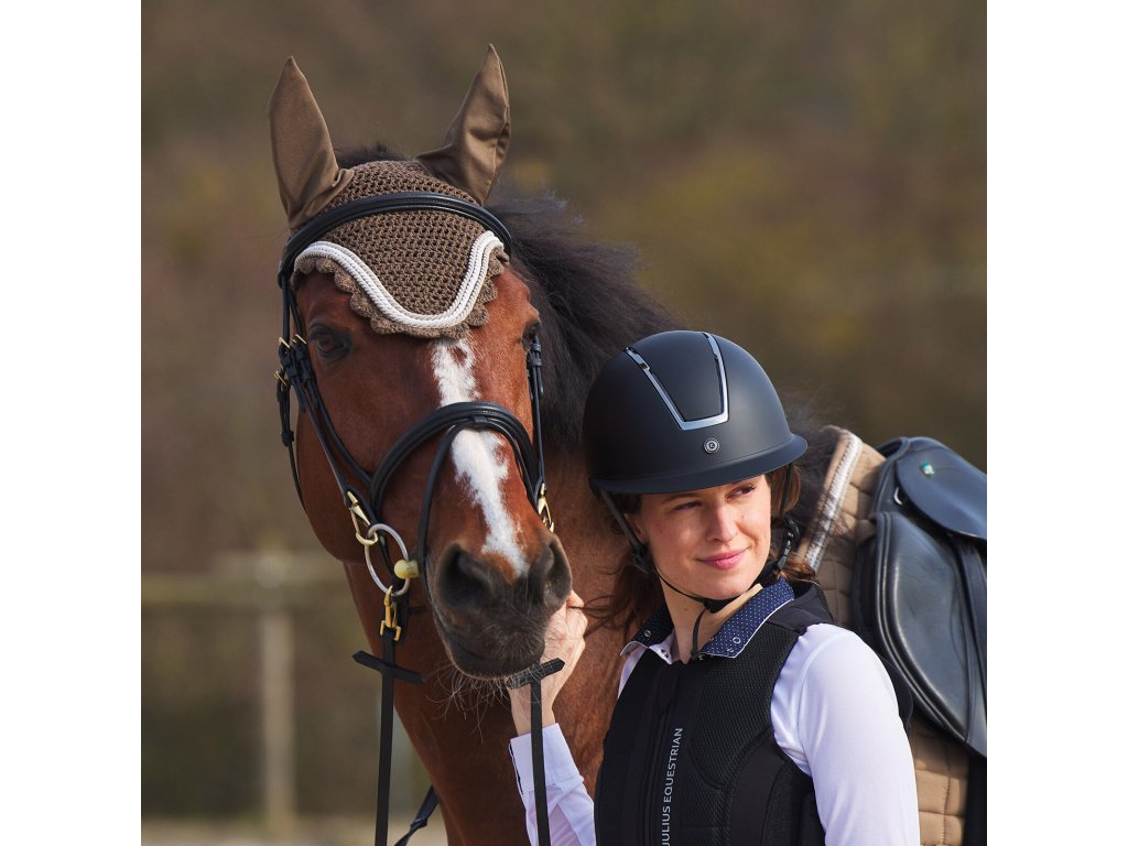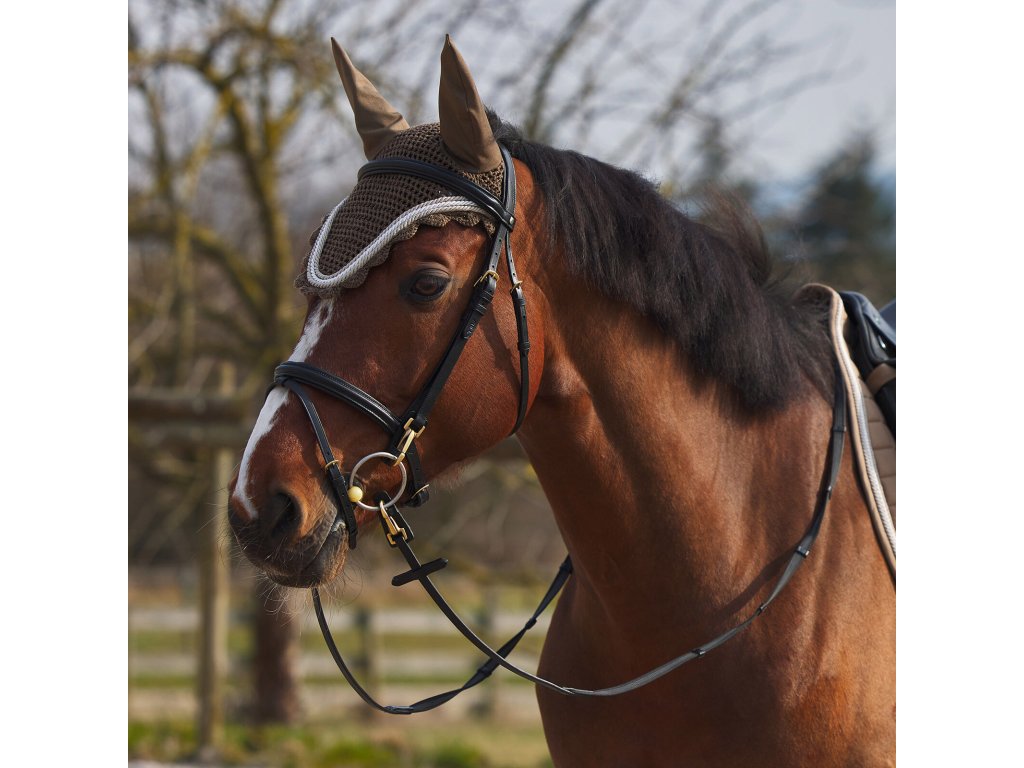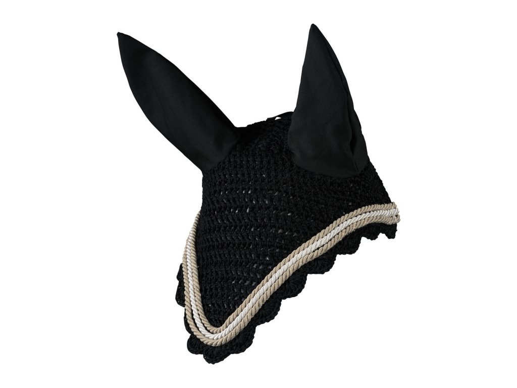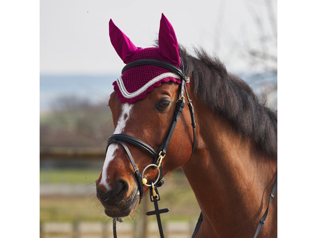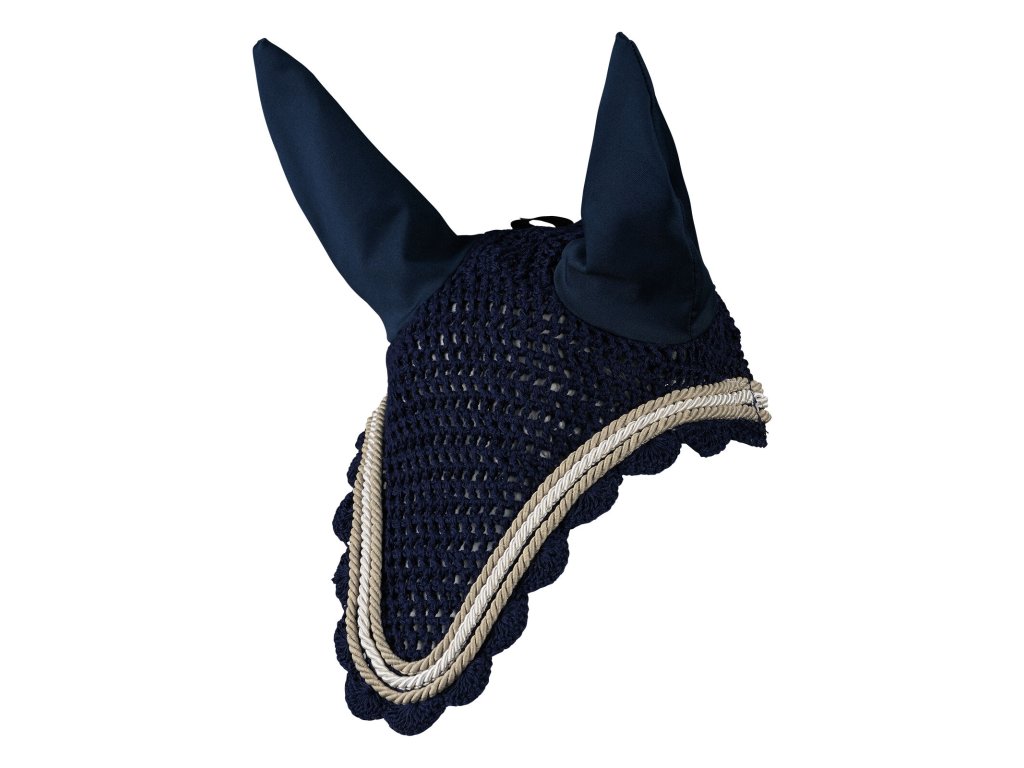 Chraňte hlavu svého koně touto čabrakou na uši, která se hodí k ostatním věcem v řadě Windsor. Tato sportovní čabraka na uši vypadá skvěle a je skutečně funkční. Omezte hluk davu a rozptylování na minimum s touto elegantní, ale sportovní čabrakou na uši. Přední strana háčkovaného designu je zdobena třemi šňůrkami na okraji v bílé a stříbrné barvě pro zdůraznění. Uši jsou prodyšná síťovina, která tlumí hluk a odrazuje hmyz. Tato síťka na uši se snadno vejde pod uzdu.