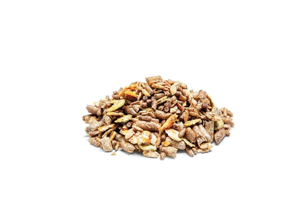 Ovesné otruby a endosperm, pšeničné otruby a endosperm, napařované vločky ječmene, kukuřičné vločky, směs třtinové melasy a sójového oleje, nutričně bohatá sláma, vločky hrášku, slunečnicová semínka zbavená slupky, rýžové otruby, sójové slupky, uhličitan vápenatý, řepkový olej, sůl, kalcinovaný magnezit, vitamino-minerální premix.