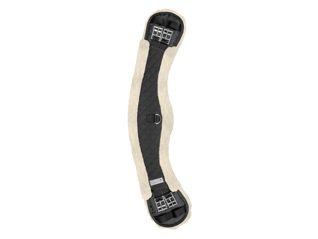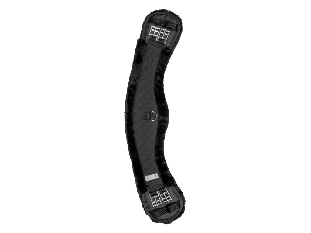 Drezurní podbřišník podšitý měkkou syntetickou kožešinou. Díky svému tvaru je tento podbřišník vhodný zejména pro koně s kulatým břichem a zabraňuje sklouznutí sedla dopředu. S D-kroužkem a válečkovými přezkami z nerezové oceli. Bez elastického materiálu.